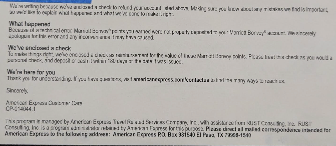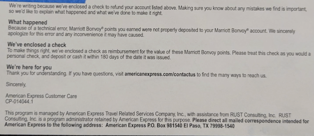 We’re writing because we’ve enclosed a check to refund your account listed above…Because of a technical error, Marriott Bonvoy® points you earned were not properly deposited to your Marriott Bonvoy® account…To make things right, we’ve enclosed a check as reimbursement for the value of these Marriott Bonvoy points…