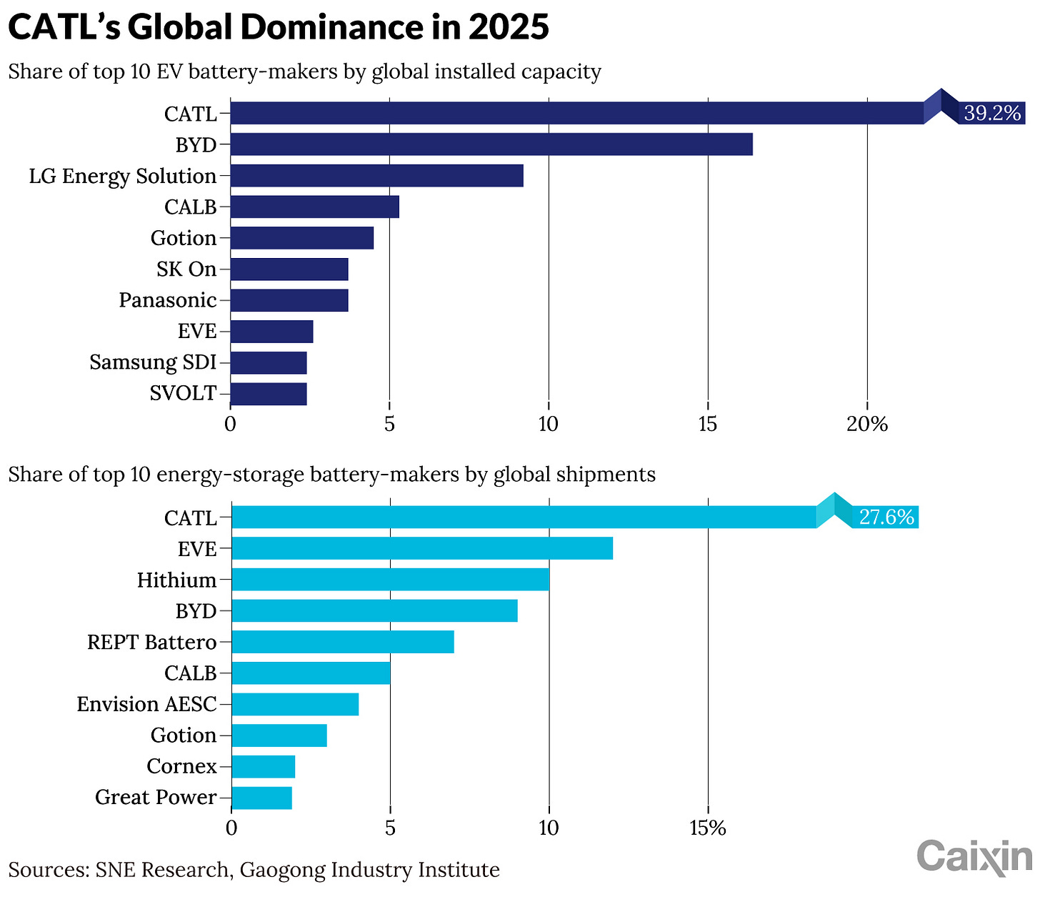 Chinese companies continued to lead the global electric vehicle (EV) battery market in 2025, with the combined share of Contemporary Amperex Technology Co. Ltd. (CATL) (SHE: 300750) and BYD Company (SHE: 002594 / HKG: 1211 / SGX: HYDD / OTCMKTS: BYDDY / BYDDF), rising to 55.6% of installed capacity, according to Seoul-based consultancy SNE Research.