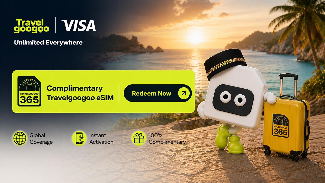 Visa Platinum: 50% off the Travelgoogoo365 Annual Plan + 1GB global 4G/5G data + 20% off additional data boosts.