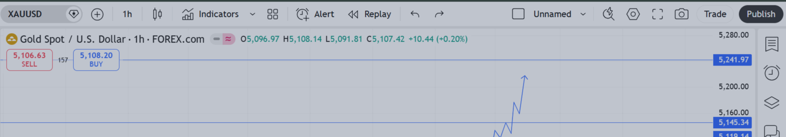 After consolidating around the 5,000 region, price has broken into expansion mode and is now trading near 5,107–5,120 resistance.