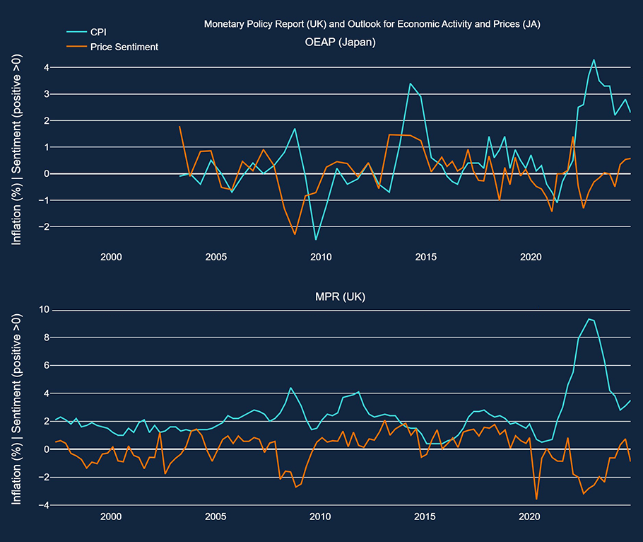 We use the Bank of England’s Monetary Policy Reports (MPRs) from 1997–2024 and the Bank of Japan’s Outlook for Economic Activity and Prices (OEAP) from 2000–24. For the MPRs, we use the analogous Inflation Reports (IRs) prior to November 2019 (beginning in 1997 when they became available in a native digital format). These documents were chosen as they are publicly available, comparable in content and from two jurisdictions with different economic and geopolitical contexts; this allows us to investigate similarities and differences in topics and sentiments over time. This blog post is an exercise in the application of NLP techniques, not a commentary on the two institutions’ policies.