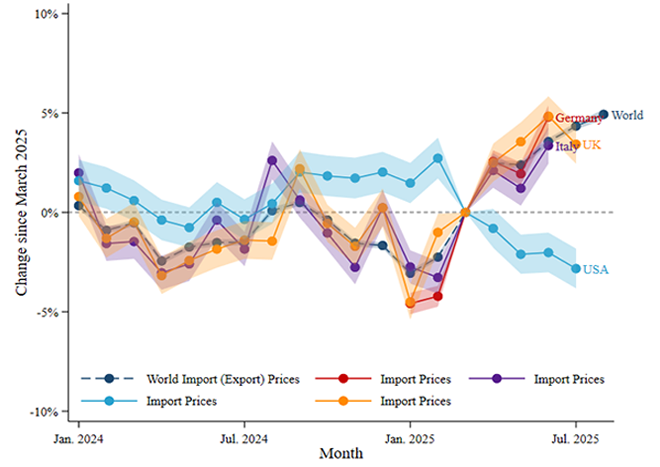 Chart 1 plots the estimated fixed effects from (1): the pattern of the corresponding blue line suggests that world import prices – and equivalently world export prices, given that one country’s imports are another country’s exports – are up about 5% by August against March 2025, that is the month before broad-based US tariffs were introduced.