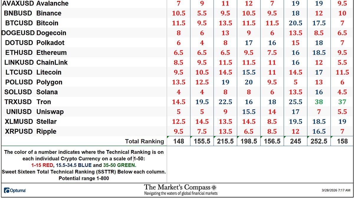 Welcome to this week’s publication of the Market’s Compass Crypto Sweet Sixteen Study #235. The Study tracks the technical condition of sixteen of the larger market cap cryptocurrencies. Every week the Studies will highlight the technical changes of the 16 cryptocurrencies that I track as well as highlights on noteworthy moves in individual Cryptocurren…