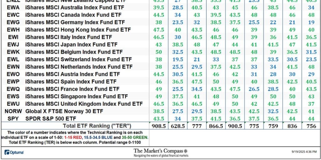 To understand the methodology used in constructing the objective DM Country ETF Individual Technical Rankings visit the mc’s technical indicators page at www.themarketscompass.com and select “dm country etfs”. What follows is a Cliff Notes version* of the full explanation…