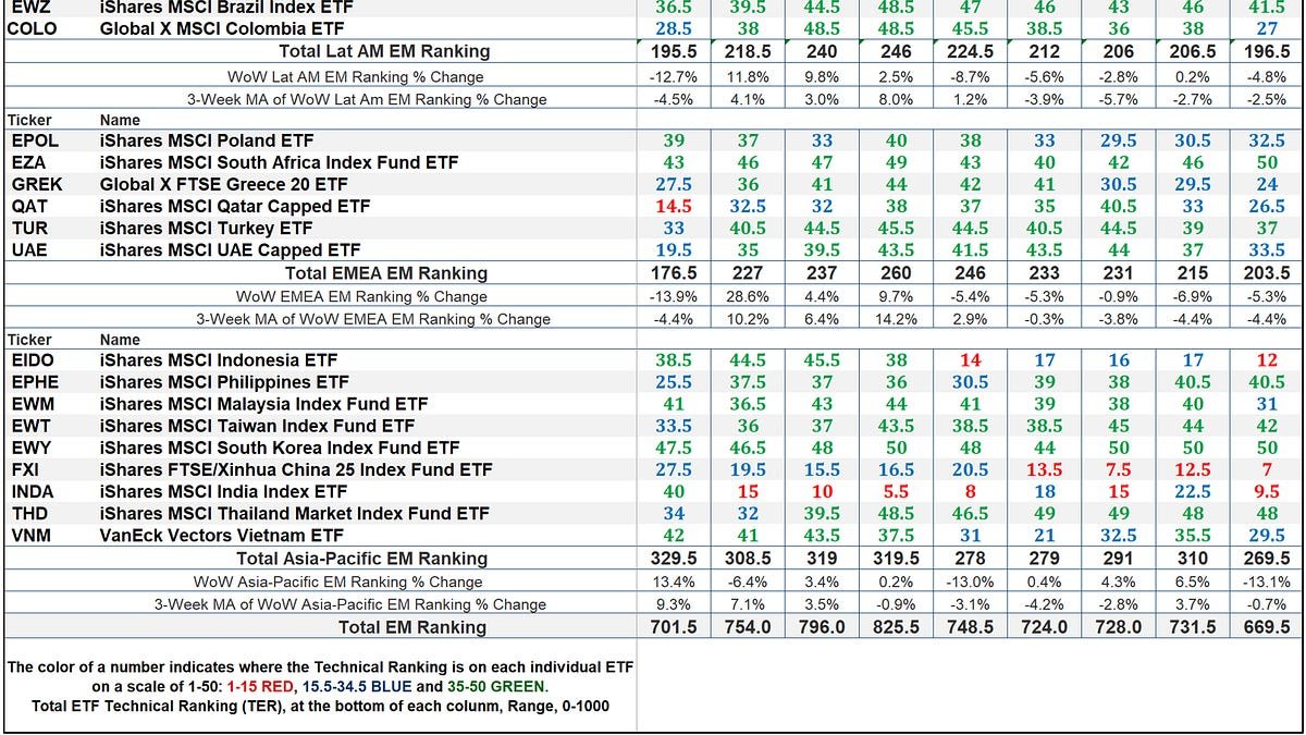 *The technical ranking system is a quantitative approach that utilizes multiple technical considerations that include but are not limited to trend, momentum, measurements of accumulation/distribution and relative strength of each individual 20 EM Country ETFs that can range between 0 and 50. The Total EM Technical Ranking or “TEMTR” is the sum of the twenty individual TRs and can be viewed as an overbought / oversold indicator as well as a confirmation / non-confirmation indicator. There is also a Total Ranking for each geographic region that can be viewed as a relative measurement on a week over week basis.