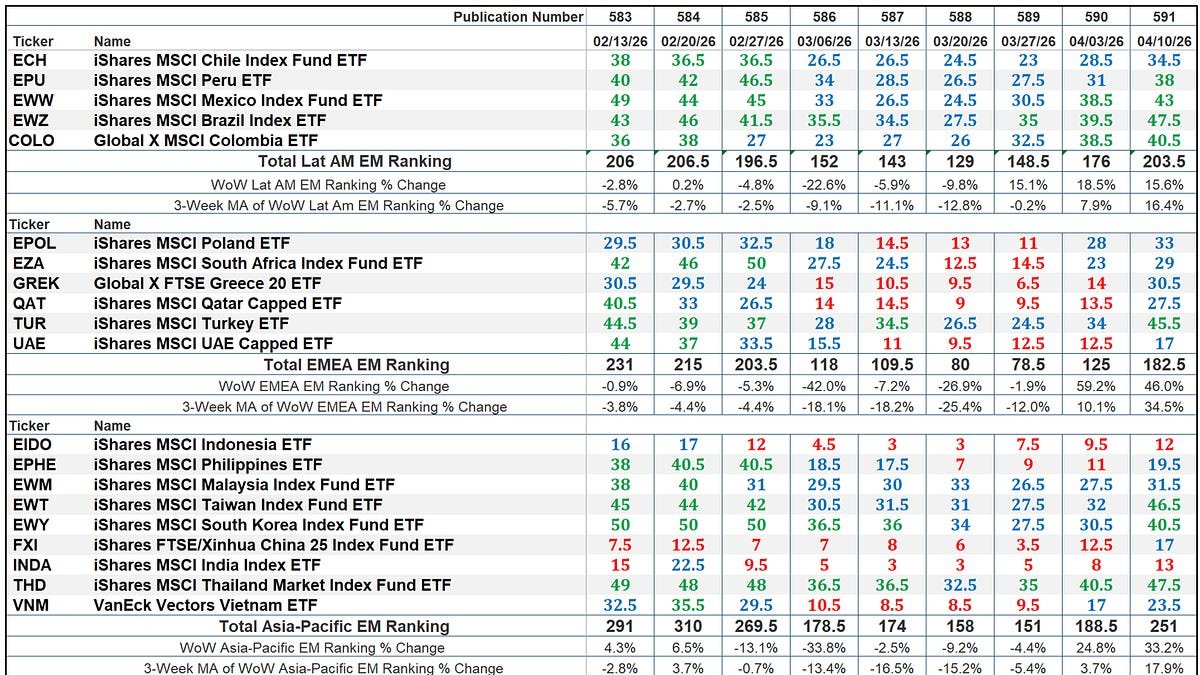 This past week The Total EM Technical Ranking or “TEMTR” rose 30.13% to 637 adding to the previous week’s 29.50% gain to 489.5 from 378 three weeks ago. The Total EMEA Ranking rose the most of the three geographic regions last week, +46.0% to 182.5 from 125 two weeks ago when it rose 59.2% from the week ending 3/27 when it reached its nadir at 78.5. Last week the Total Asia-Pacific Ranking rose 33.2% to 251 from 188.5 the week before. The Total Lat AM Ranking rose 15.6% to 203.5 from 176 the previous week.