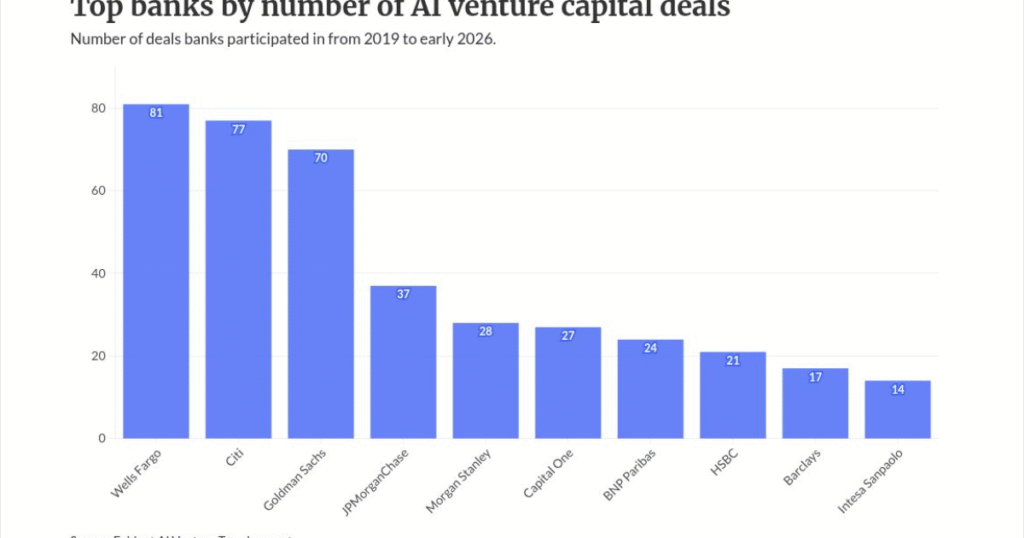 Wells Fargo, Citi and Goldman Sachs are the most active U.S. bank investors in AI companies, in that order. Wells Fargo has made 81 AI venture deals since 2019, Citi has made 77 deals and Goldman 70, according to Evident AI’s research. JPMorganChase comes in fourth with 37 deals.